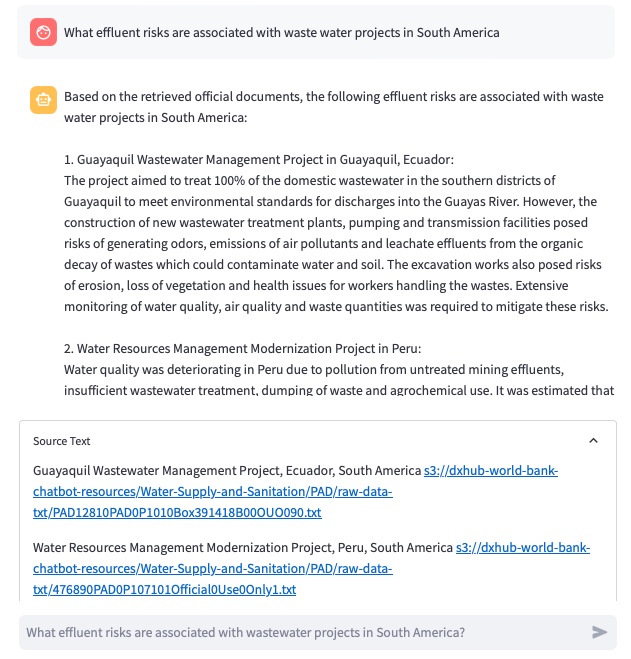 Historically, governmental project teams in countries receiving World Bank loans have faced challenges in accessing comprehensive lessons from past development projects. The vast public documentation available was cumbersome to navigate, making it a daunting task to extract relevant lessons and advice applicable to new initiatives. The solution being developed aims to overcome this barrier by offering an easy-to-use, interactive interface. This interface is built atop an intelligent search engine that probes the extensive archives, records, and data of the World Bank, streamlining access to invaluable insights. For the purpose of the pilot, the team worked with a subset of data that focused on water quality projects.