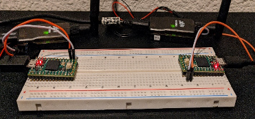 Figure 1: Teensy Encryption Device. Data encryption takes place on the right microcontroller then transmitted via radio to the left microcontroller where it is decrypted. The system uses the NSA-approved AES 256 encryption algorithm.